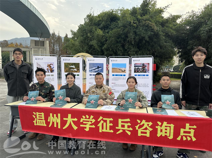 中国教育在线浙江站讯(记者 陈显婷 通讯员 王景欣 胡森宇)12月12日下午,温州大学人民武装部联合瓯海区茶山街道人民武装部在南北校区同步开展征兵宣传及咨询活动,设立“温州大学征兵咨询点”,为2026年征兵工作做好前期准备。此次活动正值国家公祭日前夕,通过弘扬爱国主义精神、深化国防教育成效,引导青年学子将历史铭记转化为报国担当。