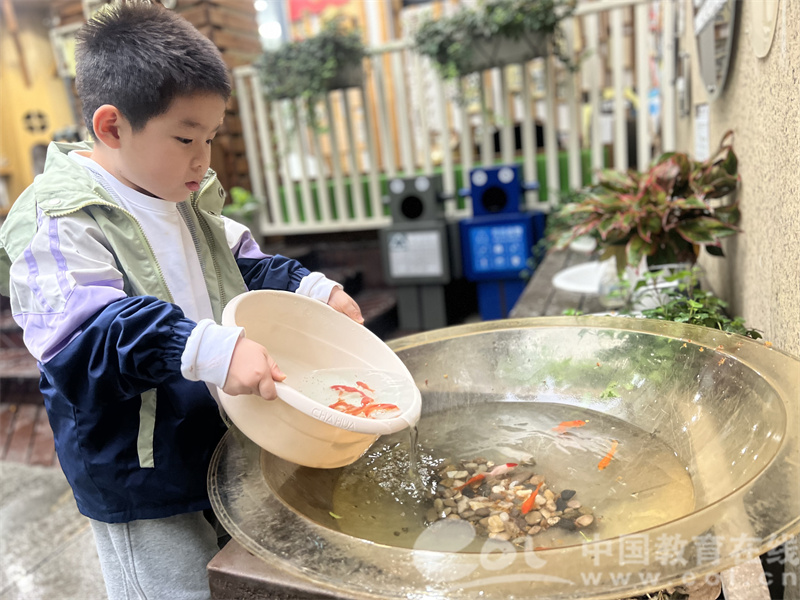 兑换结束后,孩子们化身 “园区小主人”,小心翼翼地将常春藤栽种在植物角花架上,而后轻轻浇水;轻轻地把小鱼放进动物角饲养箱中;认真地将饲料摆放到喂食区。每一个动作都充满呵护,完成 “取之于自然,回馈于自然” 的闭环。