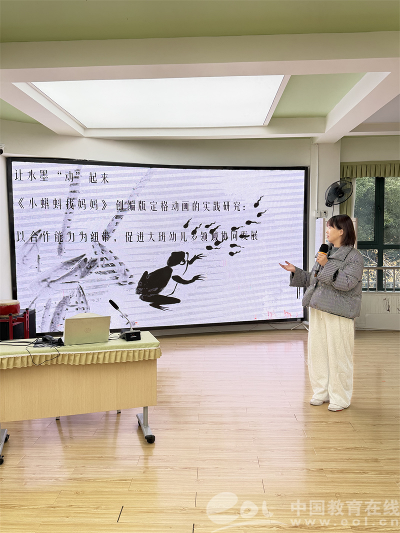盛慧洁老师的《让水墨“动”起来——〈小蝌蚪找妈妈〉创编版定格动画的实践研究》,将传统文化与大班幼儿合作发展需求相结合。孩子们历经故事创编、分工协作、道具制作、拍摄配音等全流程,自主攻克宣纸塑形、拍摄支架搭建、配音节奏把控等难题,在语言表达、社会合作、艺术创作、科学探究等多领域实现协同发展,让传统水墨艺术在幼儿的创意实践中焕发新生。