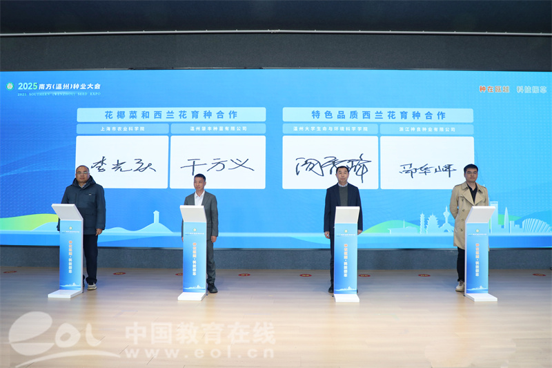 中国教育在线浙江站讯 (记者 陈显婷 通讯员 胡志伟)12月14-16日,2025年南方(温州)种业大会顺利举行。会上,温州大学生命与环境科学学院阎秀峰教授与浙江神良种业有限公司总经理邵华锋代表双方,就“特色品质西兰花育种合作”项目完成签约,这为温州特色蔬菜育种的产业化发展按下了加速键。