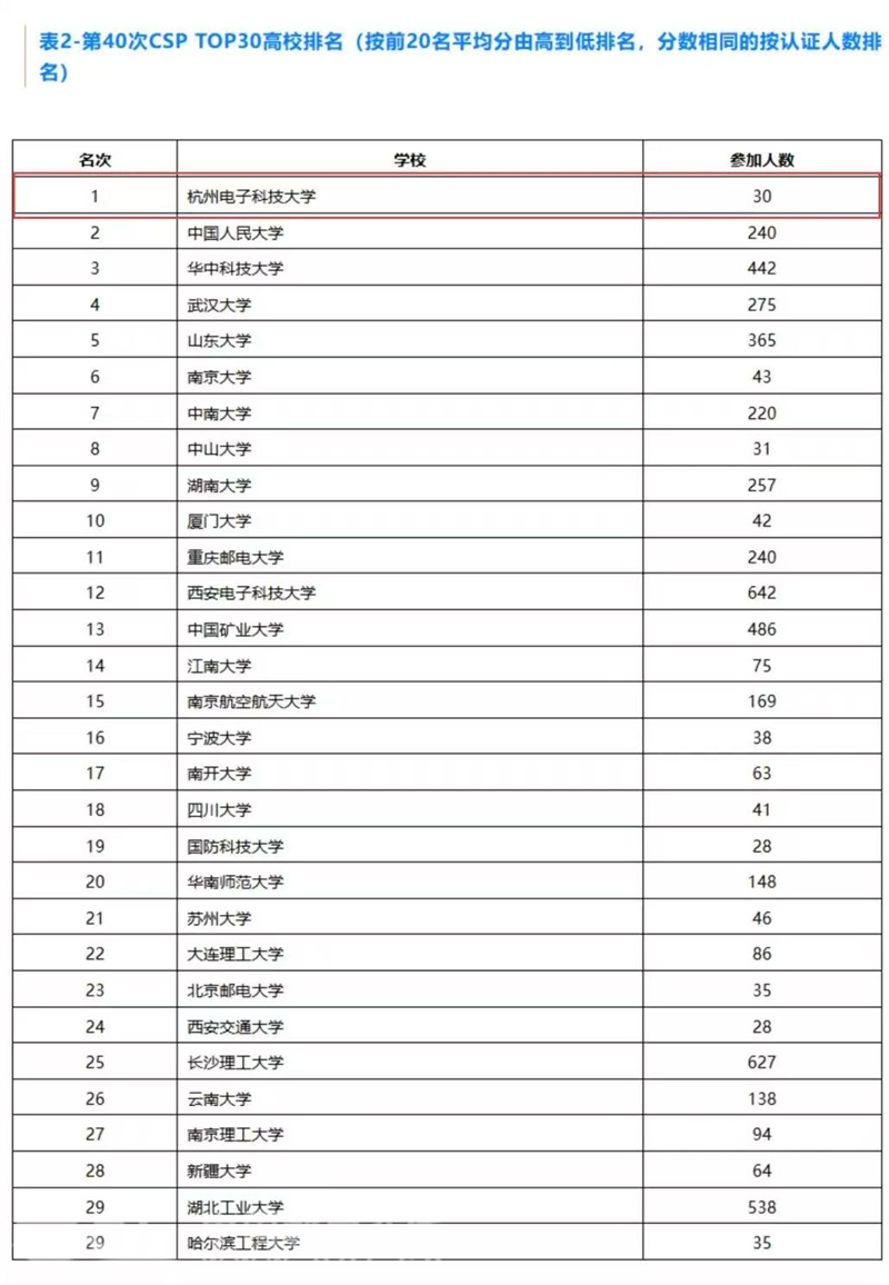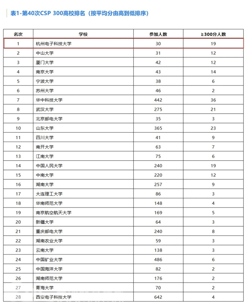 中国教育在线浙江站讯 (记者 陈显婷 通讯员 程振伟 吴雪燕)日前,记者从中国计算机学会官微获悉,第40次中国计算机学会(CCF)计算机软件能力认证(CSP)成绩揭晓,杭州电子科技大学以30人参赛、19人成绩突破300分的优异表现,在“全体参赛高校平均分排名”中位列全国第一,排名第二到第五位的高校分别为中山大学、厦门大学、南京大学、宁波大学。