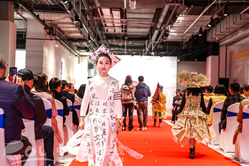 同样让观众惊讶的,还有开幕式上流·京杭——书法创意服装秀。35位学生身着水墨元素创意服装,踏着《疯狂动物城》的节奏“向观众走来”。一时间,现场变成了“秀场”,在现代童趣的诠释下,传统书法“活了”,变得可穿、可感、可舞动。