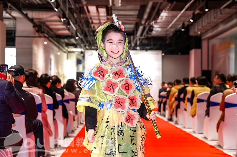 孩子的创意总能让人惊喜。303班学生牛宪泽身披自制的“岳飞战甲”踏上T台,纸板裁制的羽翼随步伐轻颤,下摆飒飒生风。“这件披风上的《满江红》全文,是我和妈妈用毛笔一起写的!”