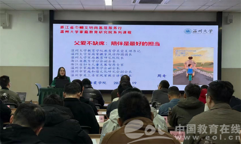 中国教育在线浙江站讯 (编辑 占尘雪 通讯员 章志图 曹晨雨 张帆)12月19日上午,作为浙江省高校“双带头人”教师党支部书记“强国行”专项行动的实践探索,温州大学教育学院教育学系党支部书记、家庭教育研究院院长、浙江省巾帼文明岗岗长、温州市家庭和谐文化研究会副会长、温州市关工委家风家教宣讲团团长周奇教授,受邀走进洞头海霞学院尚武楼205教室,为2025年温州市转业军官岗前教育培训的57名军转干部带来一场题为《父爱不缺席:陪伴是最好的担当》的专题分享。