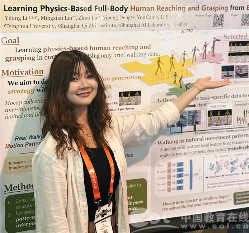 作为人工智能方向的学生,李忆唐在大二进入课题组,截至目前,她在人工智能领域已发表四篇国际会议论文。或许源于她对“人”这种形式的本能向往,她入课题组之初便选择数字人动作生成作为研究方向。传统方法依赖海量数据或人工标注,而人类动作复杂多样,她希望解放双手、减少数据依赖。通过模型设计,她仅用一小段真实走路数据作为参考,就能生成自然的抓取动作。该工作以第一作者身份被CVPR2025接收,并在“Humanoid Agent Workshop”及其他学术讨论会上展示。