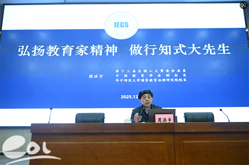 12月21日上午,温州大学育英图书馆报告厅内气氛热烈,2025年第14期溯初大讲堂在此举行。作为教育部立德树人综合机制改革试点院系,温州大学教育学院特邀中国教育学会副会长、华中师范大学国家教育治理研究院院长周洪宇教授,以《弘扬教育家精神,做行知式大先生》为题,为全院师生带来一场紧扣立德树人根本任务的精彩学术报告。报告会由温州大学教育学院院长李长吉主持。
