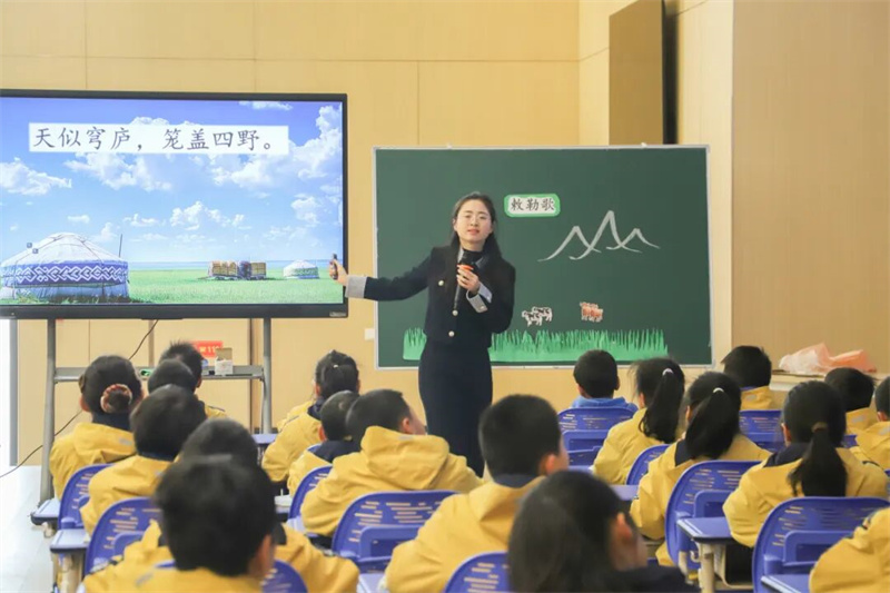 育才海辰小学潘瑜老师带来的《敕勒歌》教学,充分体现了概念课的“情境体验”理念。课堂创设“敕勒族小向导阿古拉”的虚拟形象,通过多种方式解读关键字词;运用合作读、配乐读等形式,帮助学生构建草原画面;通过拓展想象草原生灵活动,让学生感受敕勒族人民对家乡的热爱,达到了工具性与人文性的统一。
