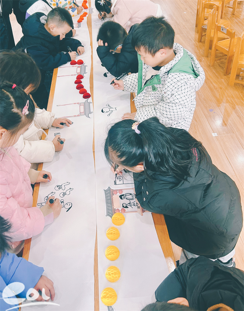 沈青娣老师基于幼儿对庙会的兴趣,设计大班创意美术活动《庙会狂欢卷》。通过动作演示与观察猜测,幼儿感知庙会角色特征;在长卷集体创作中分工协作,收获成就感。最后借助AI动效技术让画作“动起来”,幼儿在惊喜中重温庙会热闹,进一步激发了创作热情与对传统文化的喜爱。