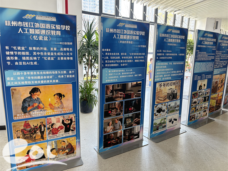 “爷爷的旧物AI复活计划”成为本次活动的情感共鸣点。学校面向全校家庭征集承载时代记忆的旧物,涵盖“烽火岁月”“勤学之路”“生活温情”三大主题,军功章、老课本、粮票、老式收音机等200余件旧物照片及故事汇聚而来。艺体科团队运用AIGC技术,为30件优秀作品生成拟人化卡通形象,制作成包含第一视角语音故事的绘本,让旧物“开口说话”。 活动现场发布的H5电子绘本,整合了旧物故事、拟人形象与语音音频;精选20件优质故事印刷而成的实体绘本集,正式纳入钱江宋韵馆馆藏。