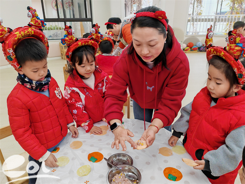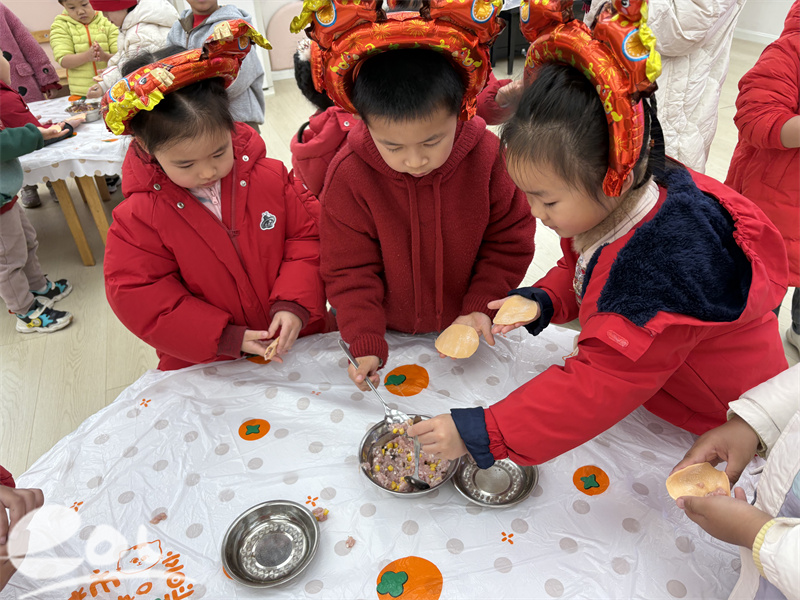 音乐厅里也热闹非凡,孩子们齐聚一起,讨论中国新年的传统美食——饺子。通过生动有趣的视频,孩子们了解了饺子的制作过程。皮子和馅来了,小朋友们各个跃跃欲试,大家洗净小手,在老师的指导下,有模有样地放馅、捏合,忙得不亦乐乎。小小的饺子,包裹着孩子们对新年的期待。随后的“美食游园会”将欢乐推向了高潮。孩子们兴致勃勃地穿梭在各个趣味摊位之间:香香爆米花、天天糖葫芦、云朵棉花糖、套圈养乐多等,孩子们吃着、玩着,笑声与欢呼声不绝于耳。