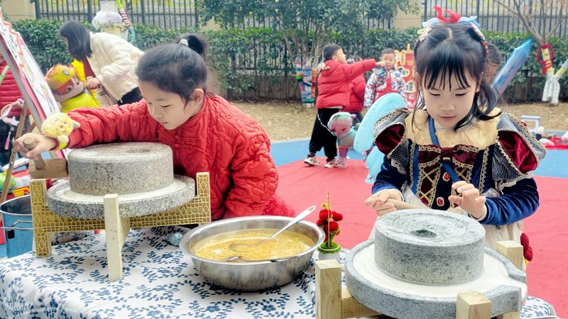 活动筹备历时数月,源于幼儿园持续深入的“冬藏”主题课程。孩子们在教师的引导下,以季节为线索,开展了一系列贴近生活的探索实践。他们在种植区亲手播下萝卜种子,通过每日浇水、观察、记录,见证种子破土、长叶、膨大的完整生长过程。在生活操作室,他们学习使用传统石磨,将一粒粒黄豆缓缓研磨成乳白的浆液,再经过滤、熬煮,亲身感受从原材料到成品的蜕变。在楼顶快乐农场,他们巧妙利用秋日收集的橘皮,经过清洗、晾晒,制作出散发着清香的橘皮香囊。这些浸润着季节轮回、凝结着劳动汗水的作品,不仅展现了孩子们对自然之美的感知与创造,更构成了此次冬藏节活动丰富而深厚的教育内核。