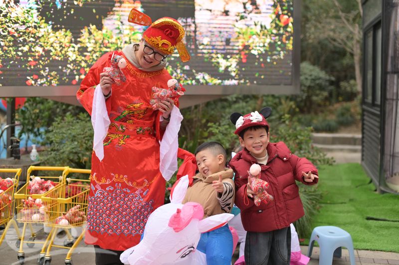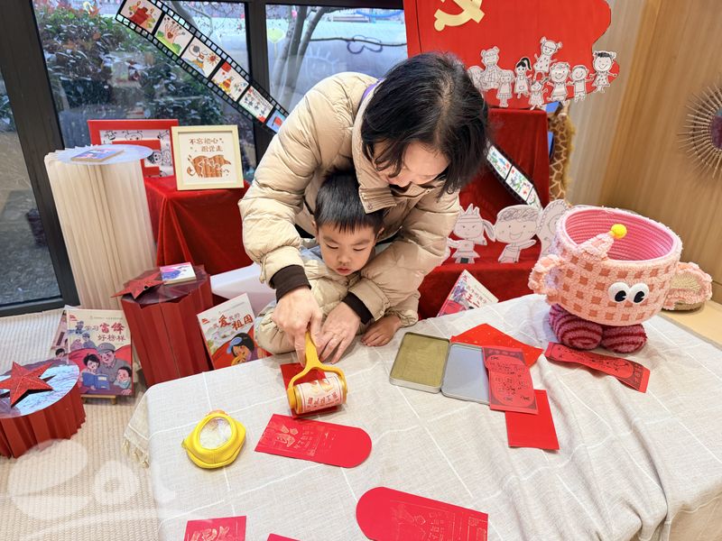 文晖园区的“庙”趣满园庙会活动热闹登场,多个特色摊位前人头攒动,成为孩子们欢乐的天地。“蒙眼摸福”活动考验着孩子们的感知力与专注力,蒙着双眼的小朋友在规定时间内摸索着寻找福字,每摸到一个便引来阵阵欢呼,现场气氛热烈非凡;“滚轮印画”摊位前,孩子们手持滚轮在空白红包上尽情创作,五彩斑斓的图案勾勒出心中的新年愿景,一个个独一无二的红包承载着满满的童趣与祝福;“套圈纳福”游戏更是人气爆棚,孩子们瞄准摆放整齐的小马玩偶,凝神聚力抛出套圈,成功套中的喜悦感染着在场的每一个人。