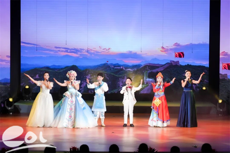 六校联唱环节由《花开忘忧》《你来了》《天路》《走月亮》《敕勒歌》《江山飞歌》组成,童声与和声的层次递进,犹如钱塘潮水般气势磅礴。