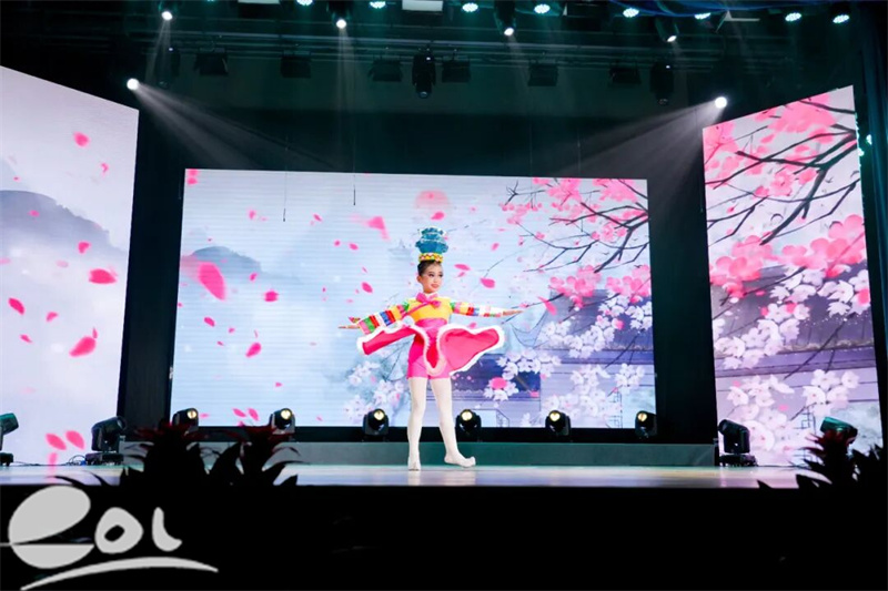 江锦小学、丁兰小学与七色花艺术团联合呈现的原创古典舞《云月》,通过水袖与多媒体投影的巧妙结合,营造出“人在月中,月在水中”的唯美意境。
