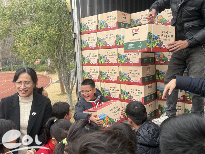 今天,认购的苹果到啦,当货车门开启时,一箱箱阿克苏苹果带着新疆的阳光气息亮相!学生代表们眼含笑意,争相上前接力搬运,红果映笑脸,指尖触到的甜香里,满是迎接新年的雀跃与期待。