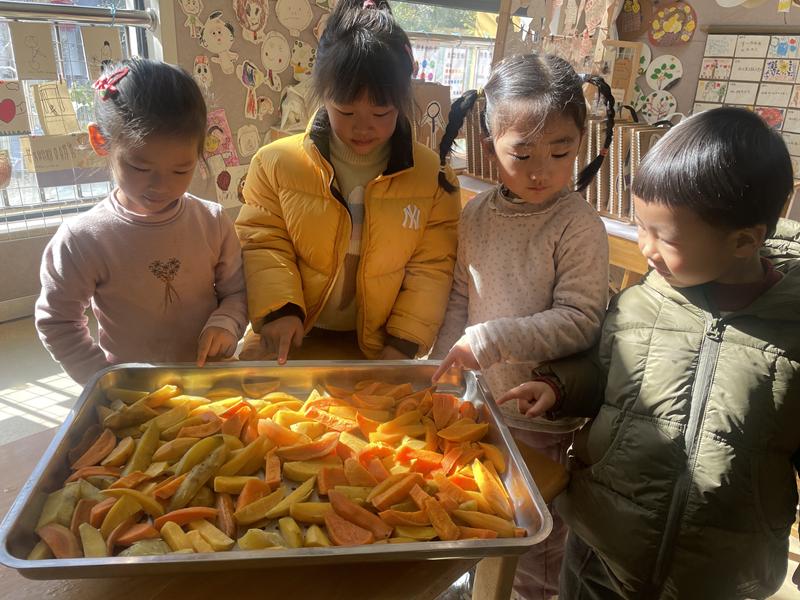 各班将腌制好的水果、蔬菜美食整齐摆放,搭配上孩子们参与制作的番薯干、南瓜饼、年糕胖等冬日美食,共同组成了“冬藏风味展”。孩子们轮流介绍自己的“藏味作品”,分享腌制过程中的小趣事:“我的萝卜条切得有点粗,但是腌出来肯定更脆!”“我放了一点点糖,这样吃起来甜甜的。”孩子们拿着自己的小餐具,互相品尝彼此的劳动成果,脸上洋溢起满足的笑容。传统美食的分享,让冬藏的味道里多了一份温暖的情谊。