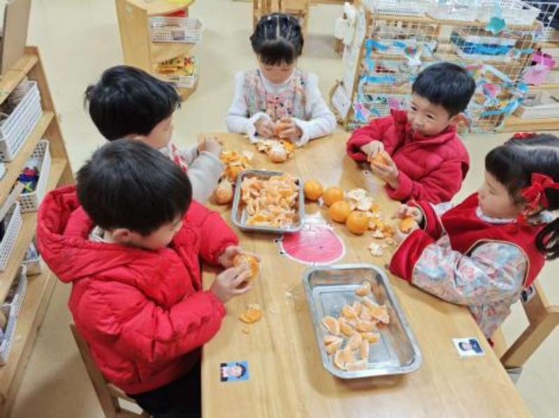 小班的孩子们与水果来了一场亲密接触。冬日里,水果在糖水的浸渍下有独特的风味。他们小心翼翼地将苹果、橘子、番茄等洗净擦干,再把切好的水果块分层装入小玻璃罐,一层水果一层冰糖,期待着酸甜果脯的诞生。