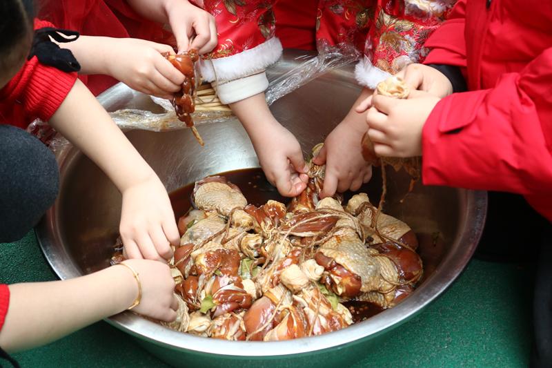 大班的孩子们则开启了传统风味的腊味制作,孩子们戴上小手套,仔细地将盐、花椒、酱油等腌制料均匀涂抹在每一块肉上,反复揉搓,确保每一处都能裹上调料入味。腌制好的酱肉、咸肉、腊鸡腿、酱鸭等等,都整整齐齐地晾晒起来,摆放在幼儿园、班级的“冬藏角”,静待传统年味美食的酿成。
