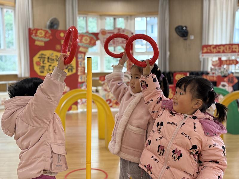 运动场上,小班穿梭“冰糖葫芦”障碍,小手稳稳地把圈精准套在柱子上。中班“接福运球”,你抛我接中迎来新年新气象。大班“球跃福门”,把满满的新年祝福和团队力量都融进了这场热闹的游戏里。汗水与笑声交织,尽显培红娃的阳光体魄。