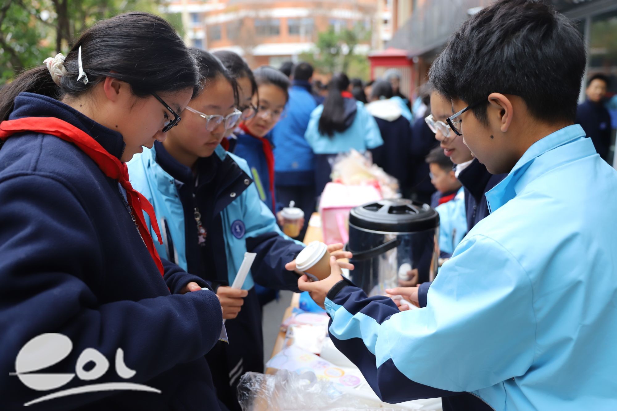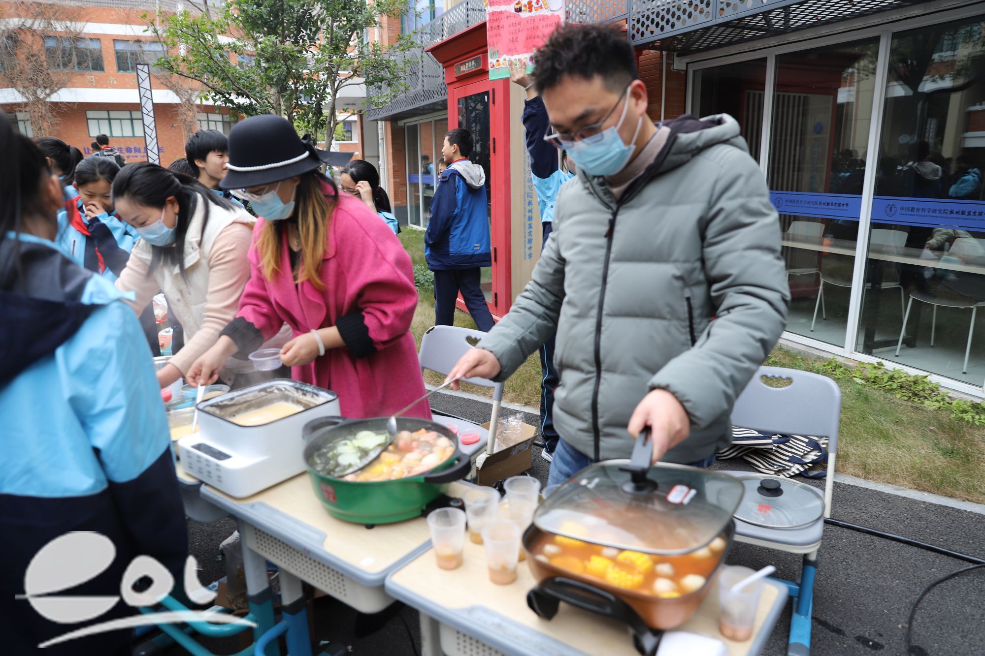 各班同学各显神通,有的组织着排队秩序,有的用真材实料现场制作美食,有的忙着收钱,现场忙而有序,阵阵香气中,洋溢着胜蓝学子的欢笑。家长们也积极参与,和同学们一起售卖商品。他们大声吆喝,参与食品制作,家校共育,其乐融融。