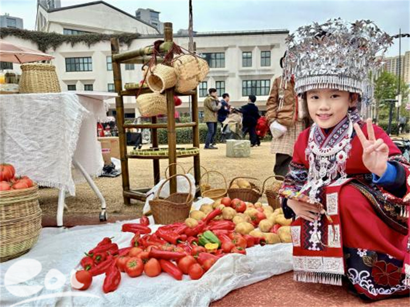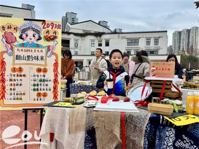 若水校区209班以“翻山黔味来”为主题,把贵州风土“搬”进摊位!小掌柜们戴着自制蜡染围裙,一手捧着杨梅雪花酥,一手举着百香果汁,边给师生盛酸汤牛肉,边用稚嫩的双语喊:“酸汤是贵州的‘魔法汤’!酸辣开胃,就像我们对大家的热情呀。”班级分工超明确,有人串洋芋粑粑,有人守着烤肉翻面,小会计飞速算收银账。从采购食材到设计摊位,家校合力打磨细节,让每一口白香果汁的清甜里,都藏着贵州山水的热烈劲儿。