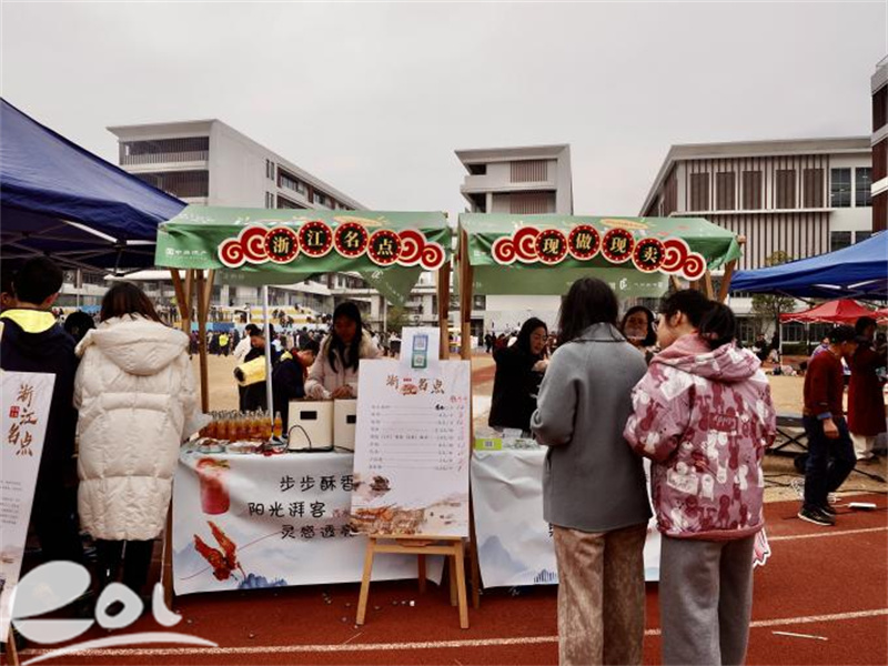 潮涌校区704班则聚焦“浙江名点主题”,现场制作缙云烧饼、酥饼等特色菜品,学子们结合寻访经历,用中英双语详细讲解美食的历史背景与制作技巧,让摊位成为文化交流的小窗口。