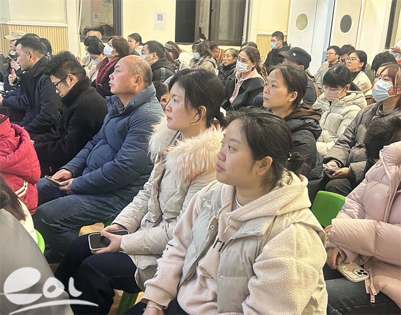 家长们凝神聆听,目光专注,笔尖不时轻触纸面,留下守护健康的注脚。银幕那端,许多未能到场的家长也静静守候在屏幕前,如同点点星光汇聚成温暖的陪伴。线上线下的心意相连共同织就了一张温柔而坚定的健康守护网。