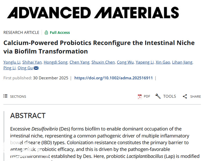 近日,浙江工商大学食品与生物工程学院顾青教授团队在国际顶级期刊《Advanced Materials》(影响因子26.8)上发表了题为《Calcium-powered probiotics reconfigure the intestinal niche via biofilm transformation》的研究论文。浙江工商大学是该论文的唯一通讯单位,顾青教授为通讯作者,李永璐副研究员为第一作者。