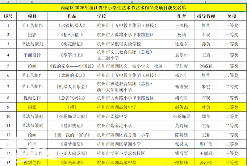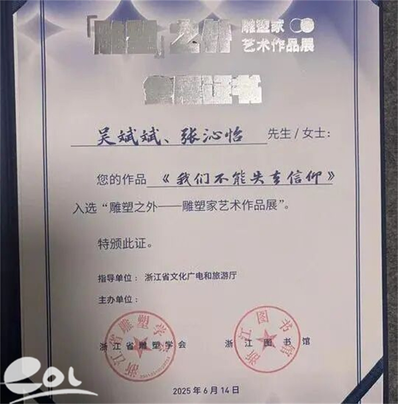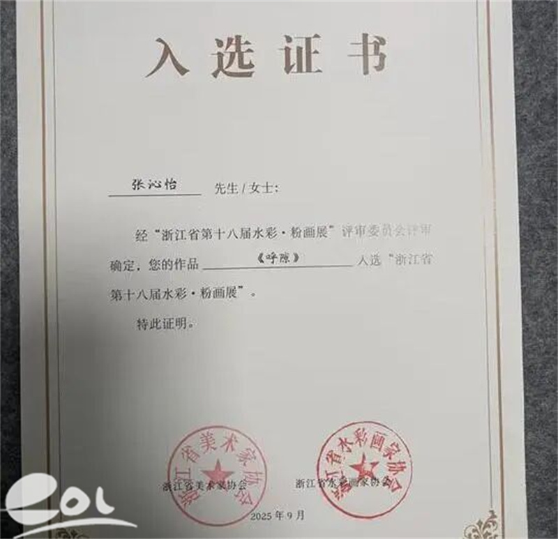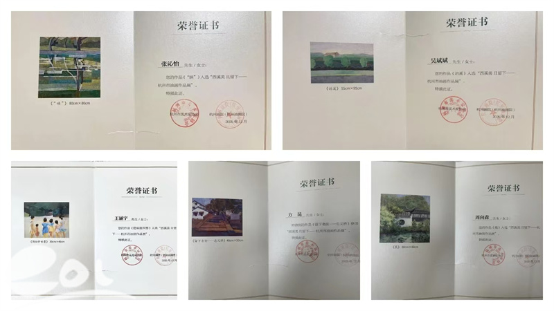此外,美术教师近期也在多项省、区级艺术展览中屡获佳绩:张沁怡老师的作品《呼隙》入选浙江省第十八届水彩·粉画展;她与吴斌斌老师合作的雕塑作品亦入选浙江省“雕塑之外——雕塑家艺术作品展”;周向森老师的作品先后入选“马跃湖山·墨启新程”2026西湖区文化馆迎新书画展及“湖山育美·笔墨传薪”西湖区美术教师献礼新时代书画作品展。