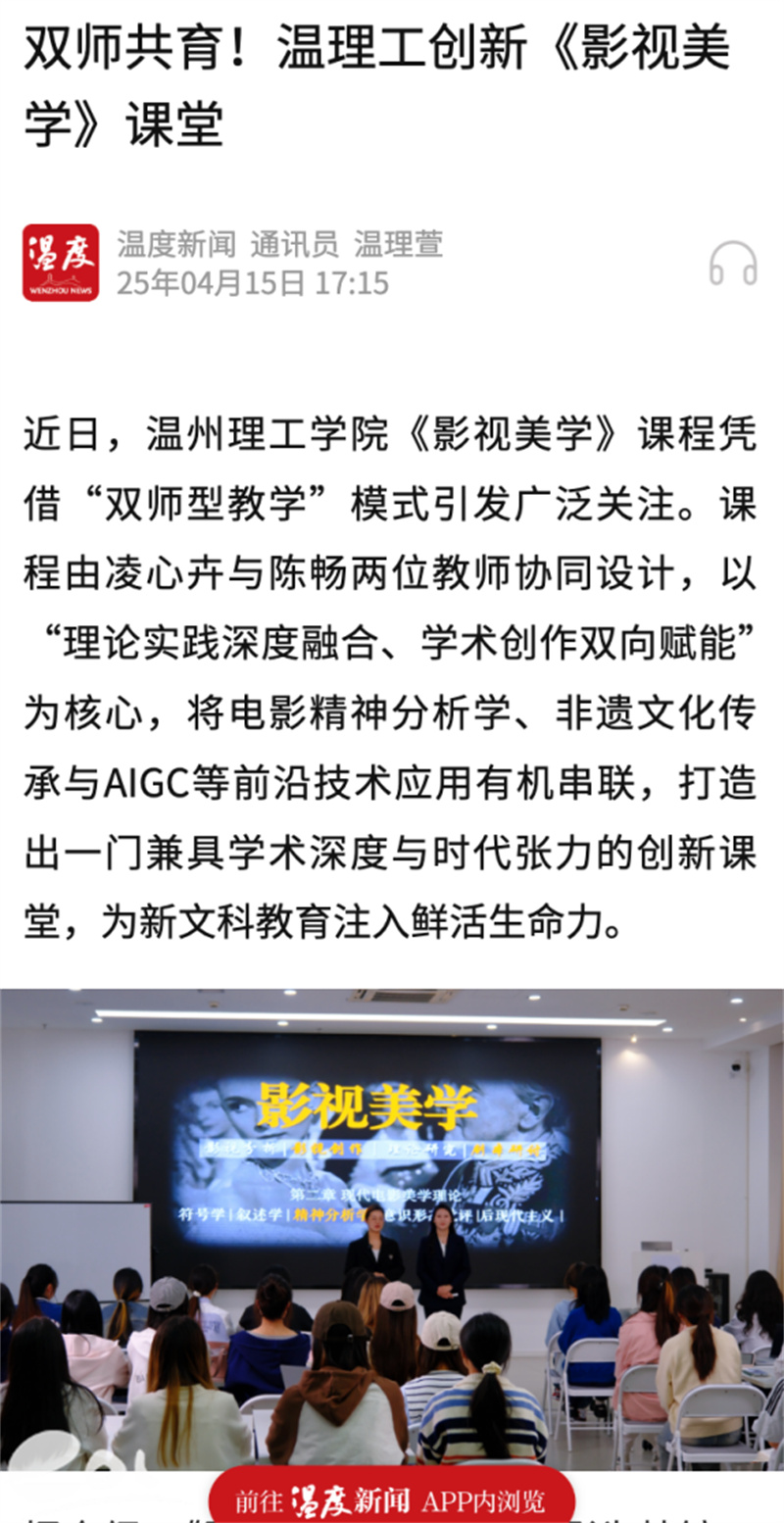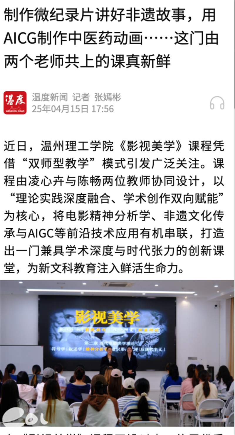在课程设计上,本次公开课创新升级了温州理工学院《影视美学》课程已有的“双师型”教学模式,引入“三师协同”新机制。该模式融合了温州理工学院的影视理论积淀与创作实践,以及新疆艺术学院的地域文化分析特色,打造出“经典影视理论+地方特色文化+前沿行业技术”三重驱动的教学新生态。
