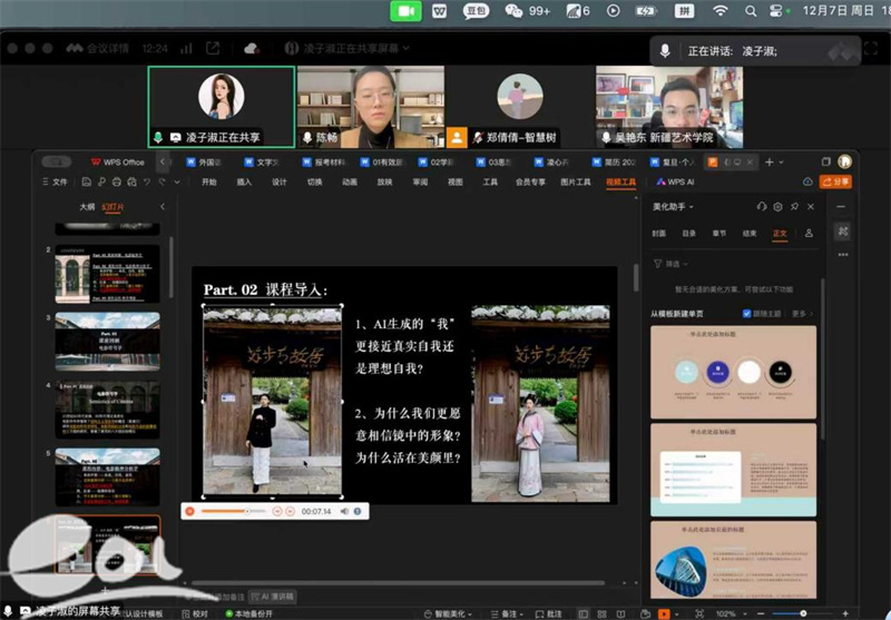 吴艳东老师以新疆多元文化为素材,引导学生探索影视如何承载地域故事;凌心卉老师从经典电影理论与精神分析视角切入,解析镜头语言与情感叙事的深层关联;陈畅老师则实时演示AI人脸修复、智能影像生成等前沿技术,带领学生动手操作。