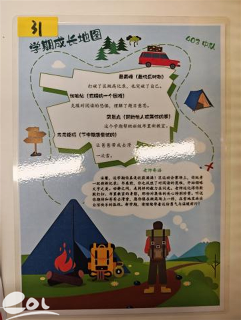 “成长地图”式评语:403中队的老师将孩子的学期经历绘成“公路旅行图”,“最高峰”标注打破跳高纪录的时刻,“加油站”记录克服阅读恐惧的瞬间,“风景点”定格为班级布置教室的温暖画面,让成长轨迹可视化、趣味化。