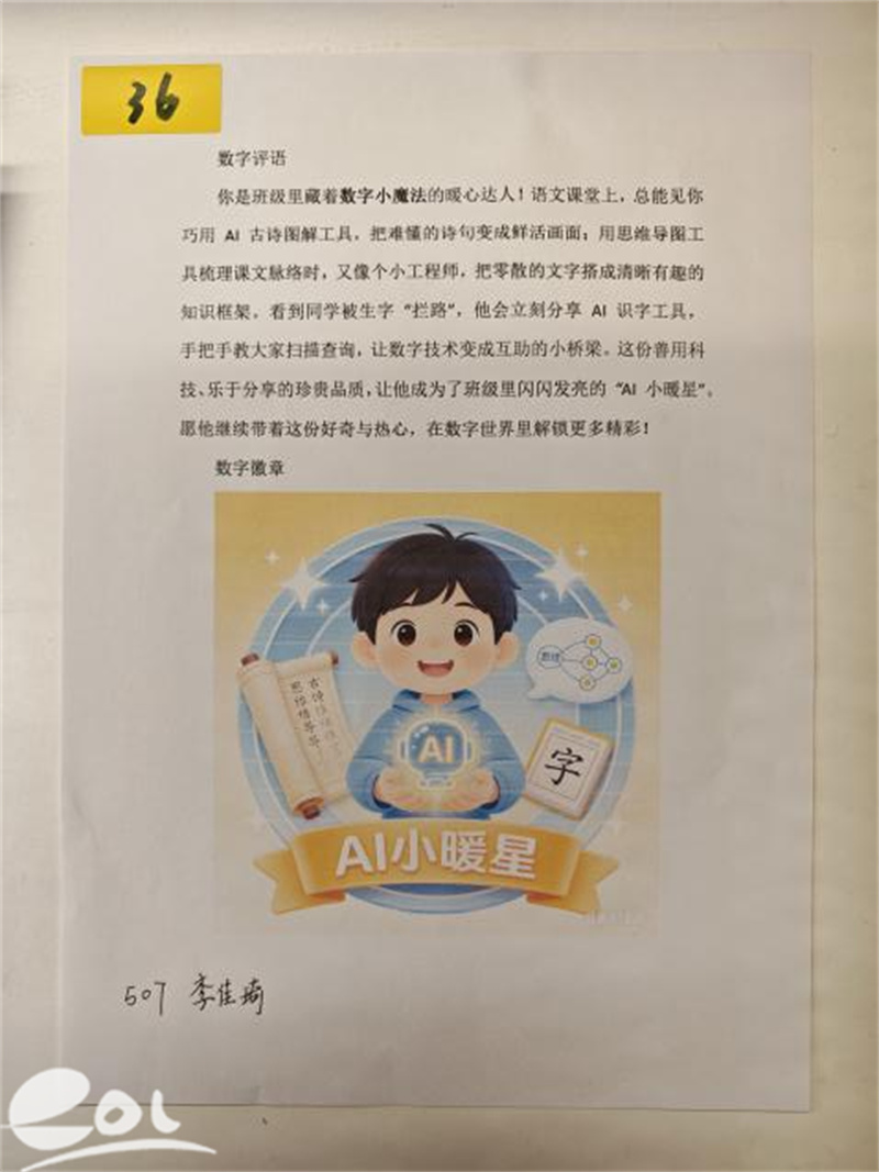AI赋能数字评语:507班的“AI小暖星”徽章评语,把学生巧用AI工具梳理课文、帮助同学识字的故事融入设计,用科技感的视觉语言,为“数字小达人”的成长喝彩。这些跳出传统文本的评语形式,让期末评价从“单向输出”变成“双向对话”,孩子们捧着属于自己的专属评语,或笑或暖,眼里满是被读懂的欢喜。
