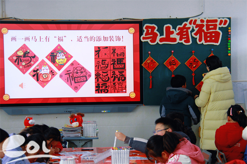 在临岐镇中心小学的教室里,没有“捐赠者”与“受助者”的身份隔阂,只有“大手拉小手”的亲密伙伴。笕桥花园小学的美术骨干教师带领两地孩子,共同创作《马上有“福”》新年福贴。