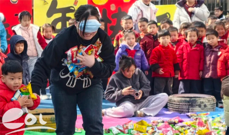 操场上,趣味闯关活动点燃欢乐氛围。抢零食大赛中,孩子们化身“超级小向导”,指引蒙眼的老师穿越障碍、抢夺零食;老师们则变身“力量小马达”,腰绑拉力绳奋力向前冲,滑稽又认真的模样让孩子们笑个不停。师生间的亲密互动,让校园充满温暖烟火气,加油声、笑声、欢呼声汇成欢快的新春赞歌。