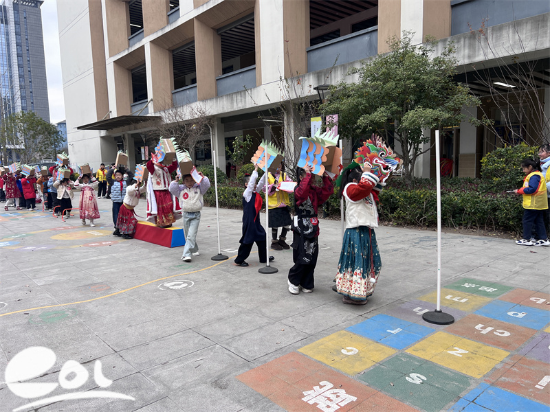 龙身齐备,龙首归位,最精彩的龙歌龙舞环节闪亮登场!小组成员们手举自制龙身,默契配合完成绕杆挑战,灵动的身姿展现出龙的昂扬气势。紧接着,欢快的旋律响起,孩子们化身"中国龙",伴着《小拜年》、《过新年》的喜庆歌声,边唱边舞,时而摆出整齐队列,时而变换灵动造型。