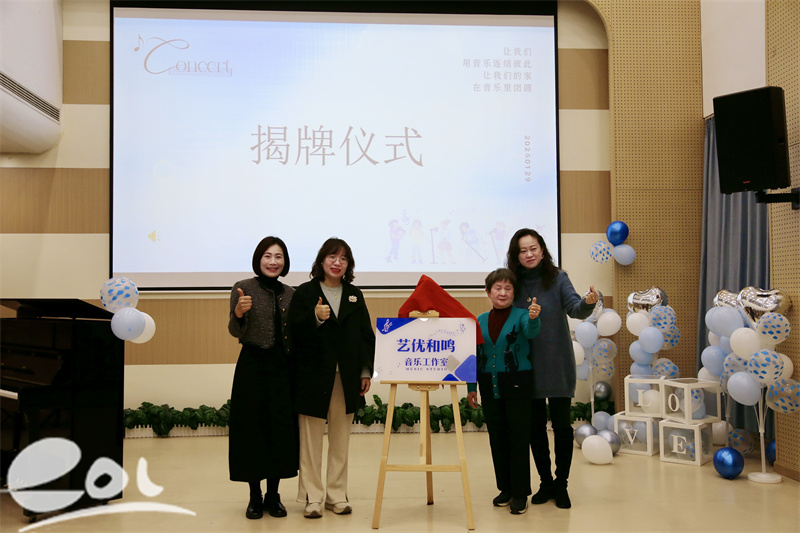 在全场热烈的掌声与期待中,孔晓燕园长、倪佳佳主任与林原祥、何靖老师共同为“艺优和鸣”音乐工作室揭牌。这不仅标志着幼儿园艺术教育的新启航,更意味着孩子们从此多了一个可自由探索、畅享美好的音乐空间。