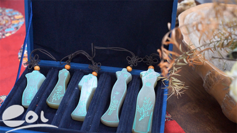 无数次深夜研讨、反复打磨设计方案,张西琴的时尚视野与董利民的非遗功底形成完美互补。他们摒弃简单的元素叠加,转而追求文化精神的深度契合,最终确定以“五韵・五和”为核心主题,将梅、兰、竹、菊、荷五种花木雅韵与采荷“和乐、和善、和美、和睦、和顺”的“五和”理念一一对应,通过金石篆刻的艺术形式呈现在旗袍之上,让每一件作品都成为可穿戴的文化载体。