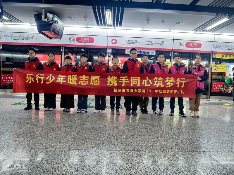 2月7日上午,九和路地铁站内涌动着一抹抹亮眼的红色——来自杭州市澎博小学401中队的“绿荫使者小队”。11名少先队员佩戴鲜艳红领巾,早早齐聚于此,开展以“暖志愿”为主题的地铁文明引导实践活动,用实际行动传递文明力量。