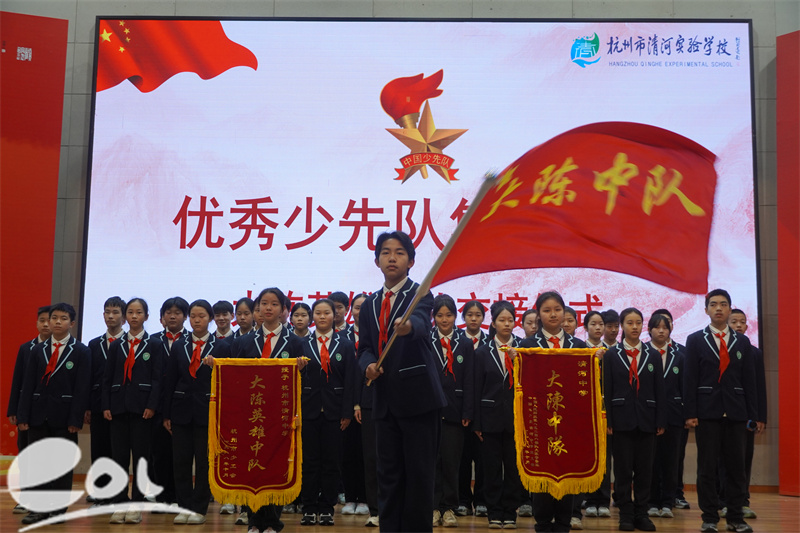 仪式上,校党支部副书记方向代表学校党支部宣读了关于命名“大陈英雄中队”的决定,并向新命名的八(4)中队授旗。这面沉甸甸的队旗,承载着大陈岛垦荒队员“艰苦创业、奋发图强、无私奉献、开拓创新”的精神,将在清河校园里代代相传。