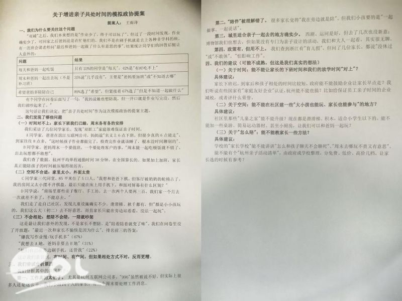 想为城市建言,先做足“功课”!本次作业中,学子们纷纷化身“城市调研小达人”,拒绝凭空畅想,802班王雨泽同学更是其中的代表,他的《关于增进亲子共处时间的模拟政协提案》,则将目光投向了杭州家庭的亲子相处痛点,成为本次作业中聚焦民生生活与社区建设融合的亮眼作品。为了完成这份提案,王雨泽通过班会课完成班级亲子相处情况统计,扒出杭州平均单程通勤38分钟等城市发展数据,还结合浙江育儿假政策落地现状展开调研,让提案的每一个问题都有真实数据支撑,每一条建议都贴合杭州城市实际与家庭需求。