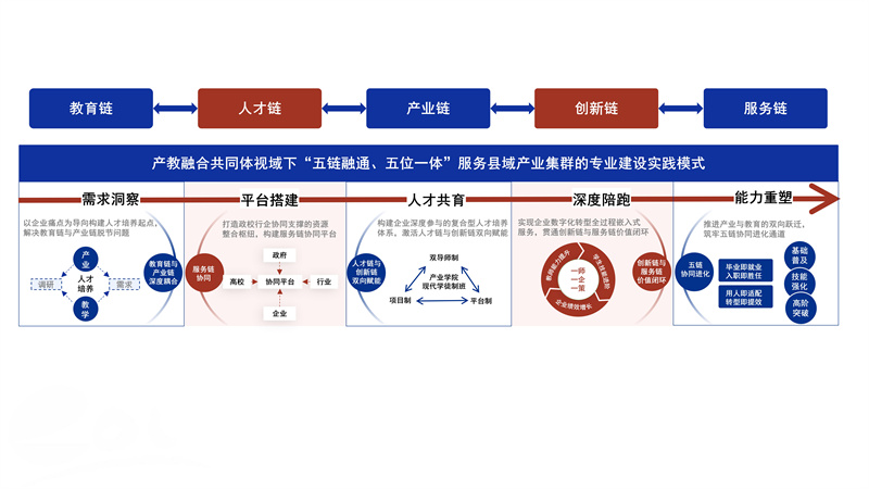 为此,学校通过与企业深度合作,提出了以产业需求为导向的人才培养新模式,紧密对接地方产业集群的转型需求。这一模式以“需求洞察—平台搭建—人才共育—深度陪跑—能力重塑”五位一体的框架为基础,构建了教育链、人才链、产业链、创新链、服务链的深度融合,成功破解了传统教育模式和产业需求之间的脱节问题。