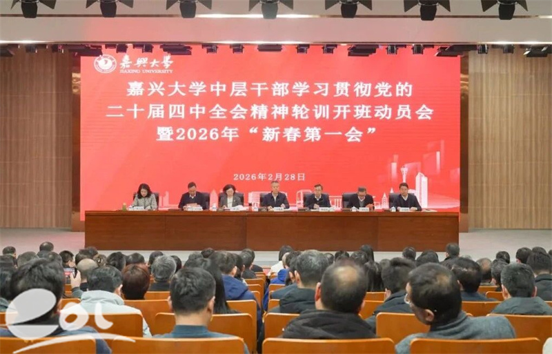 新春已至,万物更新;扬帆起航,再赴征程。2月28日上午,新学期开学第一天,嘉兴大学召开中层干部学习贯彻党的二十届四中全会精神轮训开班动员会暨2026年“新春第一会”。会议以党的二十届四中全会精神为引领,统一思想、凝聚共识、明确方向,深化理论武装,系统谋划、统筹推进学校2026年各项事业高质量发展,为新学期开好局、起好步奠定坚实基础。嘉兴大学校领导章建通、梅德庆、张琦、周宏伟、王立玮、於建明出席会议。党委副书记陈立力主持会议。