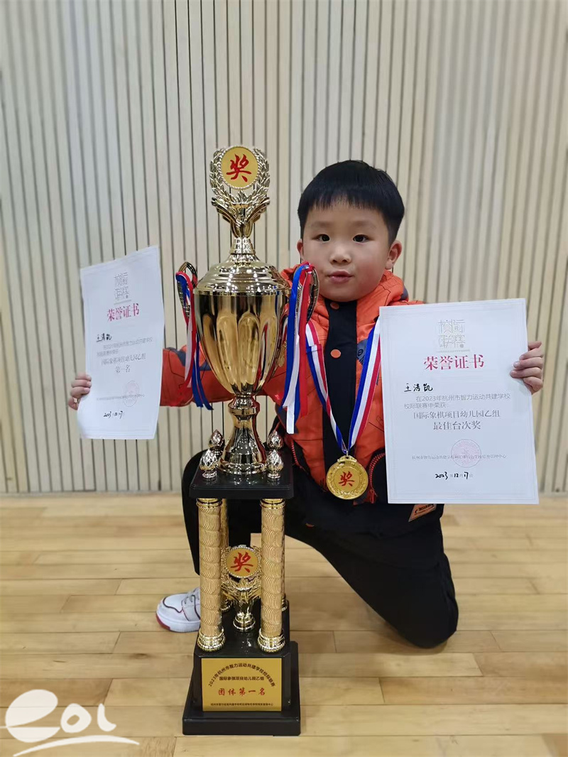 2月27日,杭州市夏衍小学104班王浩凯,在2026年全国国际象棋青少年锦标赛(个人)暨第31届“李成智杯”全国少年儿童冠军赛U8组比赛中,沉着应对全国151位优秀棋手,最终夺得男子8岁组亚军,成功取得了代表中国队参加2026年国际象棋青少年世界杯的宝贵资格。