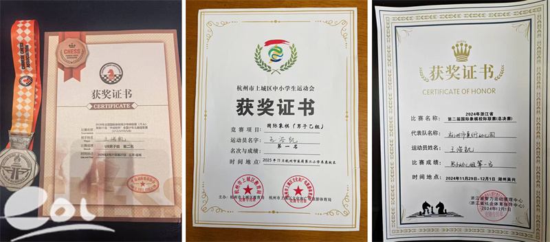 小浩凯的国际象棋之路,始于4岁那年一次偶然的家庭游戏。一路走来,硕果累累:2025年荣获上城区运动会三棋比赛国际象棋乙组金牌,2024年率队夺得浙江省国际象棋校际联赛总决赛第一名。这份成长的背后,是科学系统的训练、丰富的赛事磨砺以及家校共育的坚实支撑。