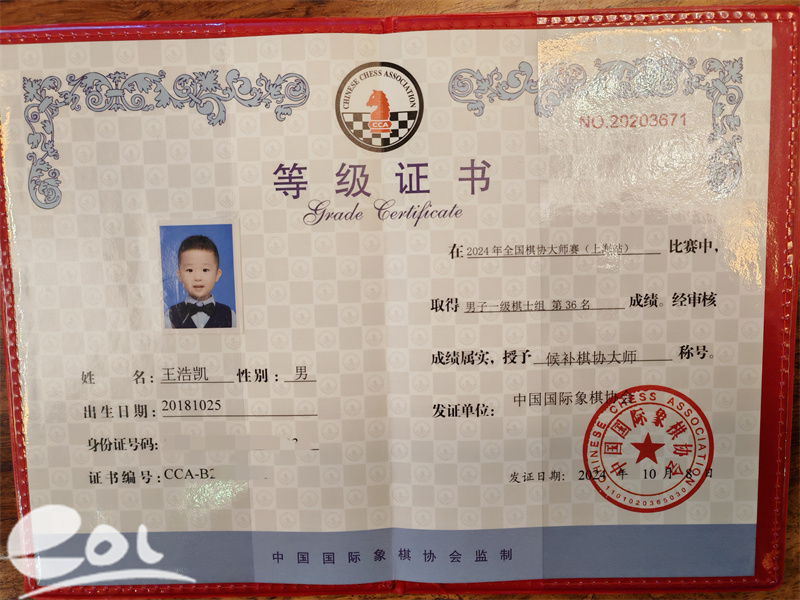 尽管小浩凯还只是一名一年级学生,但他棋龄已有4年。2025年8月,小浩凯获得中国国际象棋协会认证的业余最高等级——棋协大师称号。他是目前杭州市一至二年级学生中唯一的棋协大师。