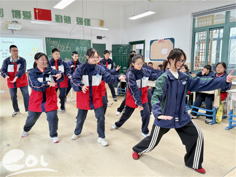 赵珍妮老师携手谭明鹤、虞悦等武术队同学打造武术双语课堂,结合武术队国际交流经历,用双语讲解武术动作的文化内涵,在一招一式间传递刚柔并济的武术精神,实现中西方文化的深度碰撞。