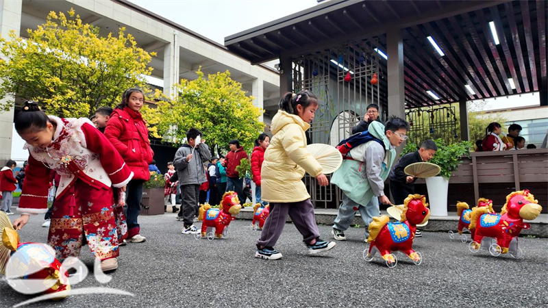 同步开放的4个马年趣味游戏摊位人气爆棚。“小马跳格冲冲冲”中,孩子们手持竹马道具,一起闯关;“马年套圈赢好运”里,大家凝神投掷,收获专属福气;“马年吉祥幸运签”充满仪式感,孩子们抽取幸运签,合影留念;“马到成功向前进”考验耐心,学子们用扇子扇动充气小马前行,践行奋进信念。