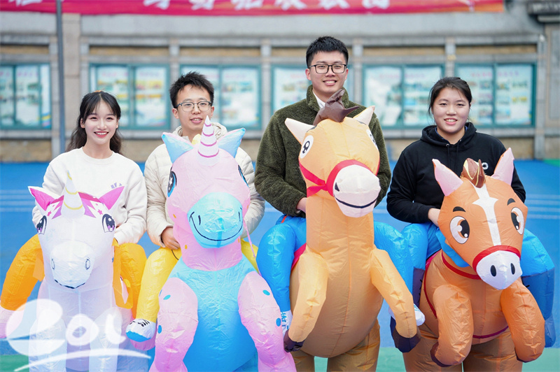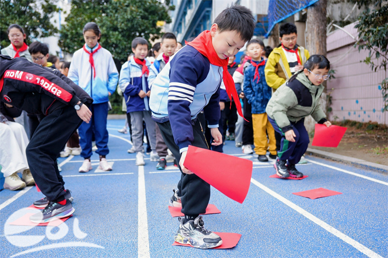 早晨,两校区门口已是欢腾一片。三处主题游戏打卡点前人头攒动,孩子们兴致勃勃地参与“马”主题的三项特色互动游戏:“马上有福”的福字卡片在空中轻晃、“小马过河”的红色地垫铺成蜿蜒小路、“马到成功”的气球小马正等着大家用扇子轻扇向终点。每一个游戏都藏着对新学期的美好祝愿,在趣味挑战中赢取新学期的好彩头。