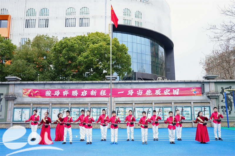 校民乐团表演了二胡齐奏《赛马》。激昂的旋律如万马奔腾,气势磅礴,瞬间点燃全场热情。琴弦上跳跃的音符,仿佛在为每一位天长学子擂响新学期奋进的战鼓。